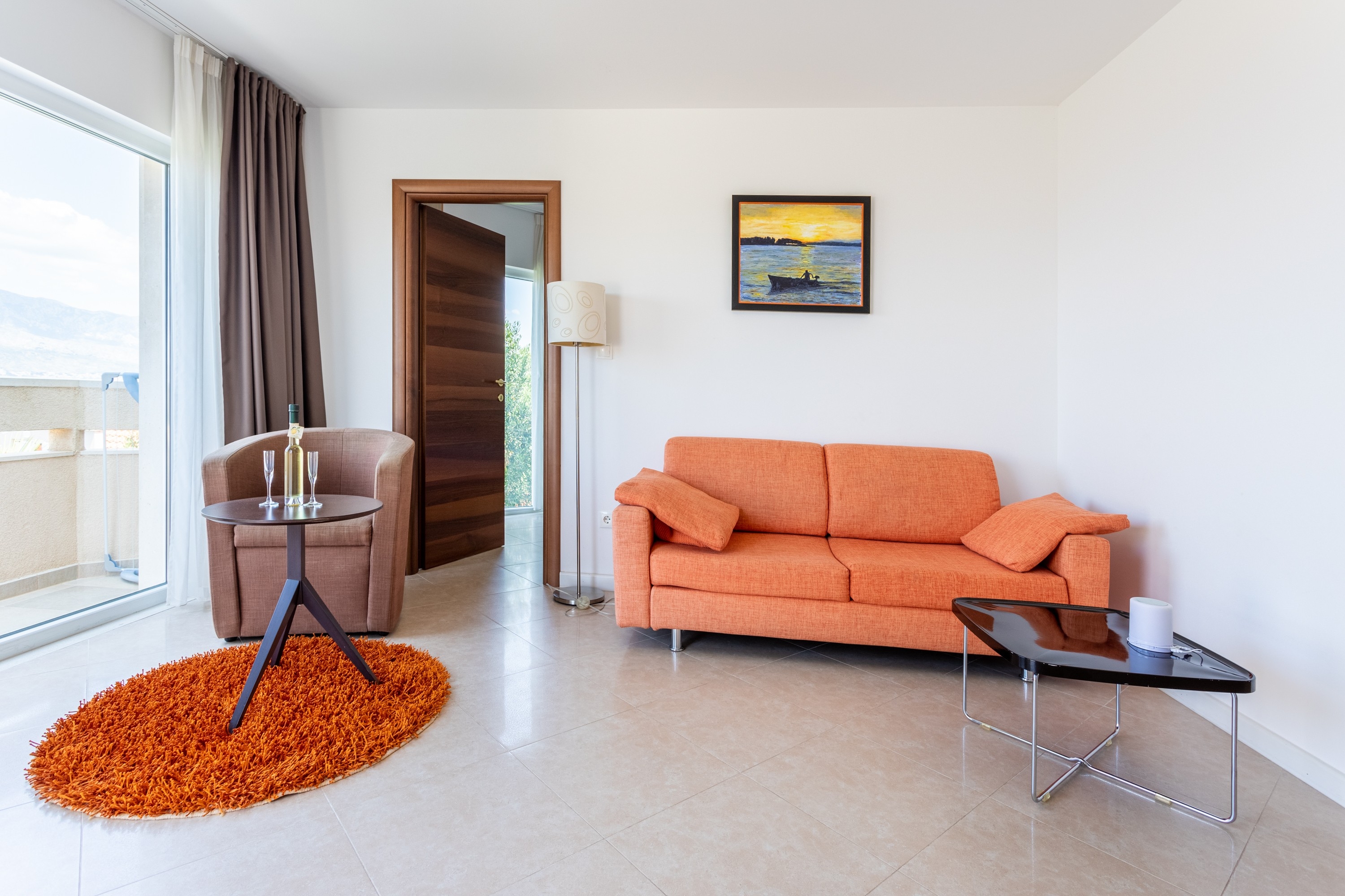Apartment can accommodate 2 guests. Beds are situated in 2 sleeping rooms, within 52m2. Guests can use a private terrace to enjoy the warm summer evenings. The apartment offers the sea view. Food can be prepared using barbecue which is shared with other guests too. Shared pool is on disposal during stay. INCLUDED IN THE PRICE: tourist tax, final cleaning, air-conditioning, central heating, pool, parking, internet, baby cot, iron, ironing board, hairdryer, 2 beds for children (included in the price). OBLIGATORY ADDITIONAL COSTS: short stay fee (surcharge depending on a number of booked nights: 30% - 1, 20% - 2, 10% - 3). The availability of additional services for your chosen dates of stay, as well as their prices (if none are listed) must be checked ahead of time. Any additional services not shown in the price calculation are payable directly to the property owner and only if used by the visitor.