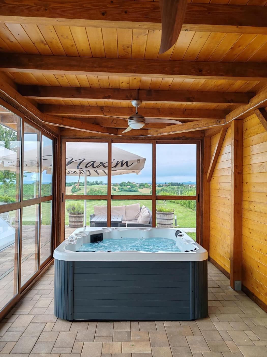 Three-Bedroom House. This holiday homes standout features are the pool with a view, hot tub and sauna. Boasting a private entrance, this air-conditioned holiday home includes a kitchen, 3 bedrooms and 1 bathroom with a bath and a shower. Guests will find a stovetop, a refrigerator, a dishwasher and kitchenware in the fully equipped kitchen. The holiday home also features a barbecue. Featuring a terrace with garden views, this holiday home also offers a washing machine and a flat-screen TV. The unit has 6 beds.