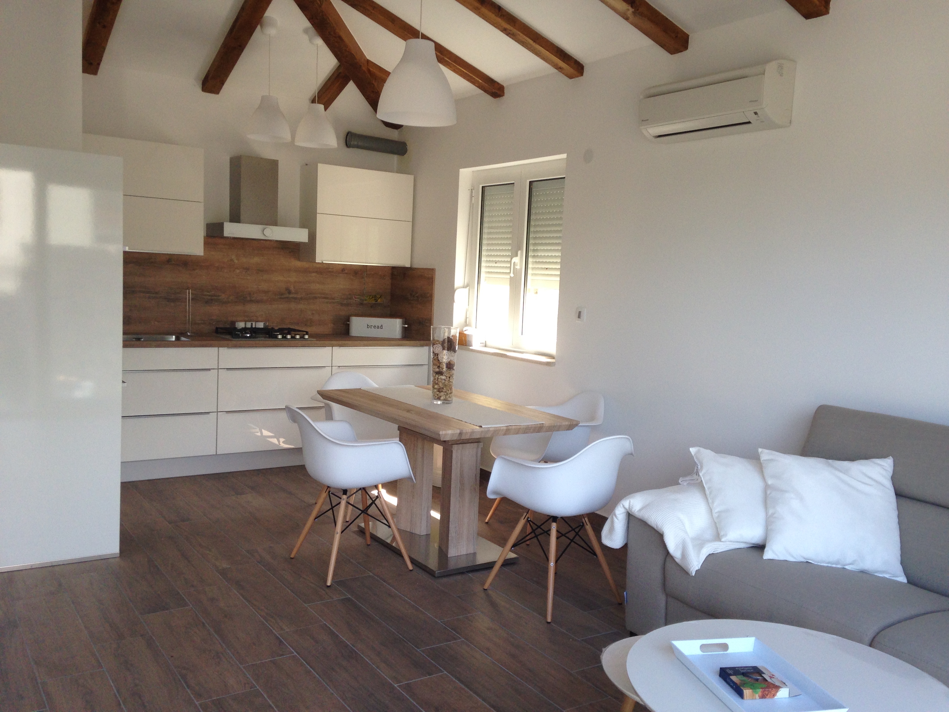 House can accommodate 6 guests. Beds are situated in 2 sleeping rooms, but also in the living room, within 50m2. Guests can use a private terrace to enjoy the warm summer evenings. For full enjoyment and relaxation there is a private barbecue for this accommodation guests only. This accommodation unit welcomes pets at an additional charge. INCLUDED IN THE PRICE: tourist tax, final cleaning, air-conditioning, central heating, parking, internet, baby cot, iron, ironing board, hairdryer. OBLIGATORY ADDITIONAL COSTS: short stay fee (surcharge depending on a number of booked nights: 30% - 1, 20% - 2, 10% - 3). OPTIONAL ADDITIONAL COSTS: pets (€5.00 per night). The availability of additional services for your chosen dates of stay, as well as their prices (if none are listed) must be checked ahead of time. Any additional services not shown in the price calculation are payable directly to the property owner and only if used by the visitor.