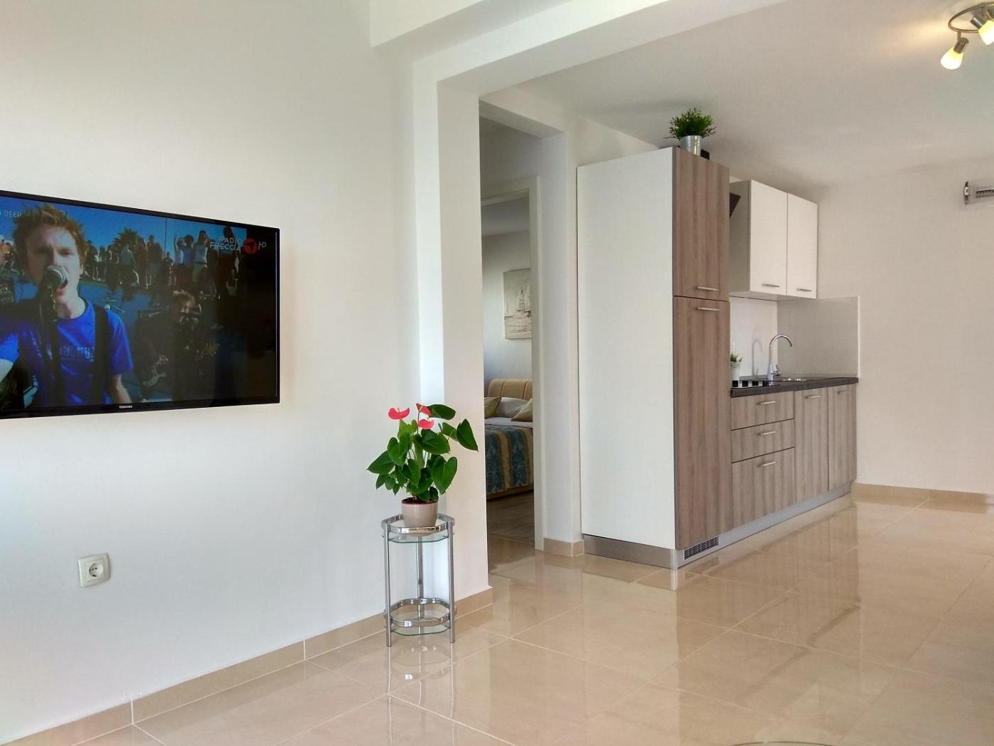 The apartment provides guests with a terrace, sea views, a seating area, satellite flat-screen TV, a fully equipped kitchen with a fridge and a stovetop, and a private bathroom with shower and a hair dryer. A balcony with an outdoor dining area and mountain views is offered in every unit. At the apartment complex, each unit has bed linen and towels.