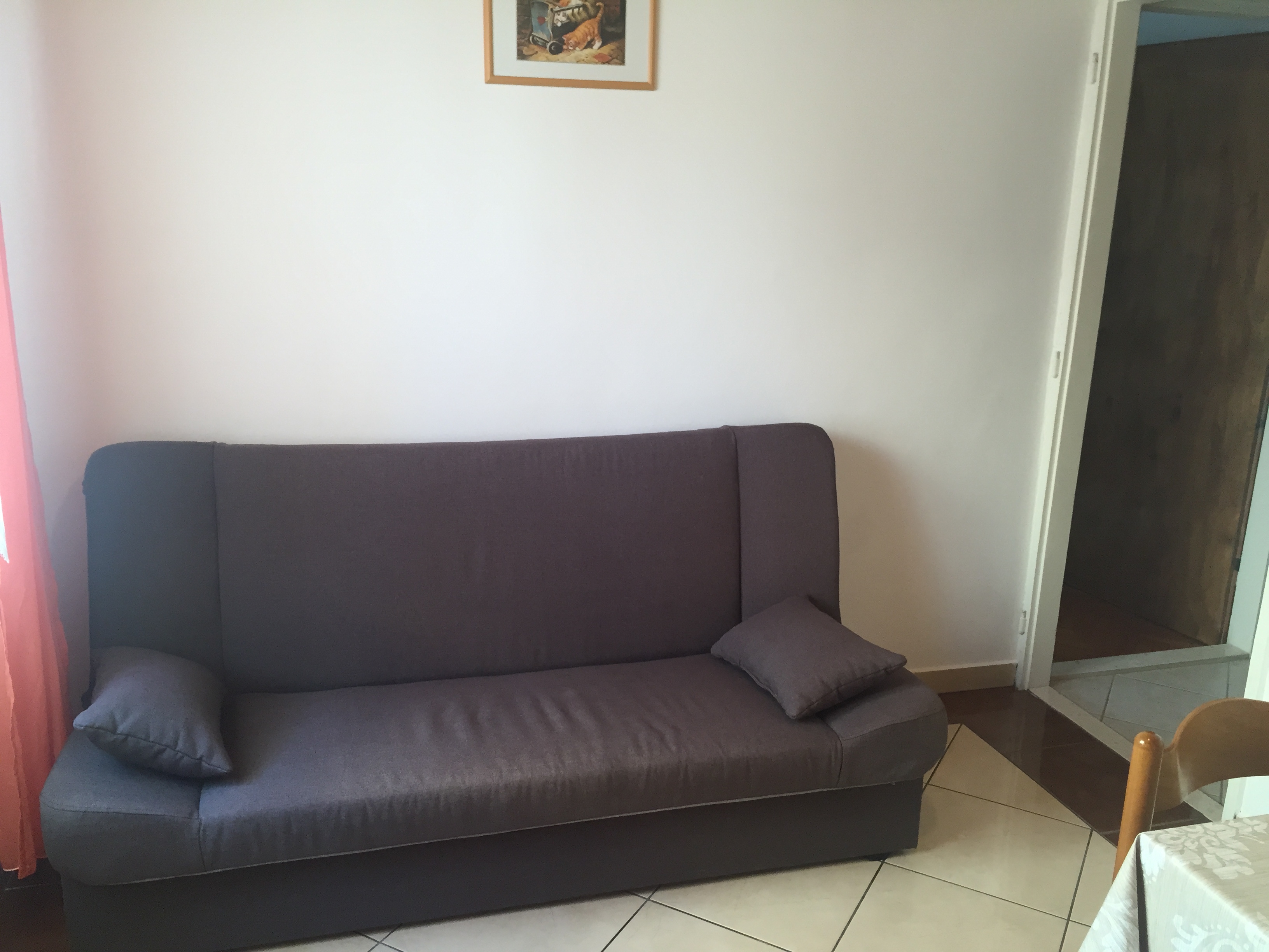 Apartment can accommodate 4 guests. Beds are situated in 1 sleeping rooms, but also in the dining room, within 35m2. Guests can use a private terrace to enjoy the warm summer evenings. The apartment offers the sea view. Food can be prepared using barbecue which is shared with other guests too. This accommodation unit welcomes pets at an additional charge. INCLUDED IN THE PRICE: tourist tax, final cleaning, parking, internet, boat mooring, hairdryer, sunshade, sunchairs. OBLIGATORY ADDITIONAL COSTS: short stay fee (surcharge depending on a number of booked nights: 30% - 1, 20% - 2, 10% - 3). OPTIONAL ADDITIONAL COSTS: air-conditioning (€5.00 per night), pets (€5.00 per night). The availability of additional services for your chosen dates of stay, as well as their prices (if none are listed) must be checked ahead of time. Any additional services not shown in the price calculation are payable directly to the property owner and only if used by the visitor.