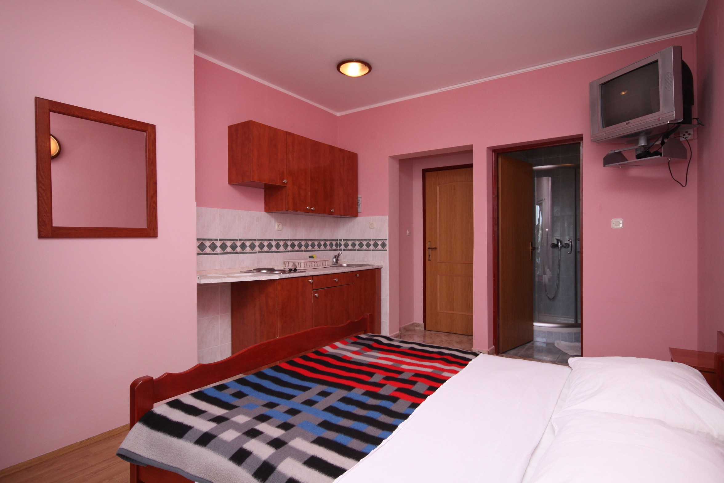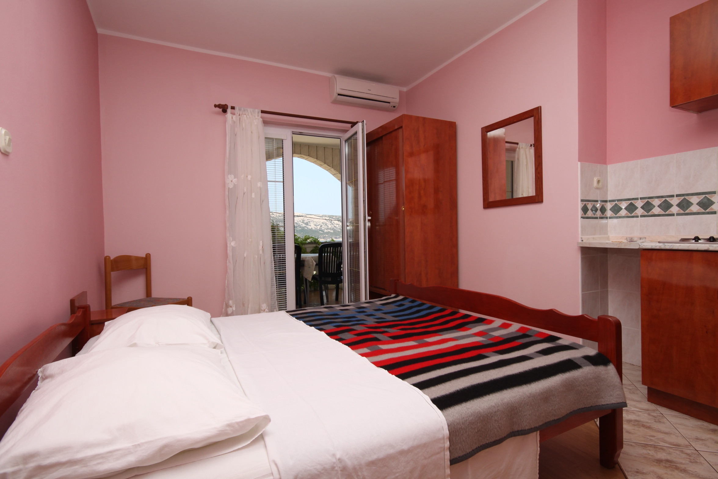 Studio flat can accommodate 2 guests. Beds are situated in 1 sleeping rooms, within 17m2. Guests can use a private terrace to enjoy the warm summer evenings. The studio offers the sea view. Food can be prepared using barbecue which is shared with other guests too. For the booked accommodation unit the deposit is paid directly to the owner upon check-in (deposit amount is displayed on the website) INCLUDED IN THE PRICE: tourist tax, final cleaning, air-conditioning, parking, internet. OBLIGATORY ADDITIONAL COSTS: deposit (€150.00 one-time payment), short stay fee (surcharge depending on a number of booked nights: 30% - 1, 20% - 2, 10% - 3). OPTIONAL ADDITIONAL COSTS: laundry (€10.00 washing). The availability of additional services for your chosen dates of stay, as well as their prices (if none are listed) must be checked ahead of time. Any additional services not shown in the price calculation are payable directly to the property owner and only if used by the visitor.