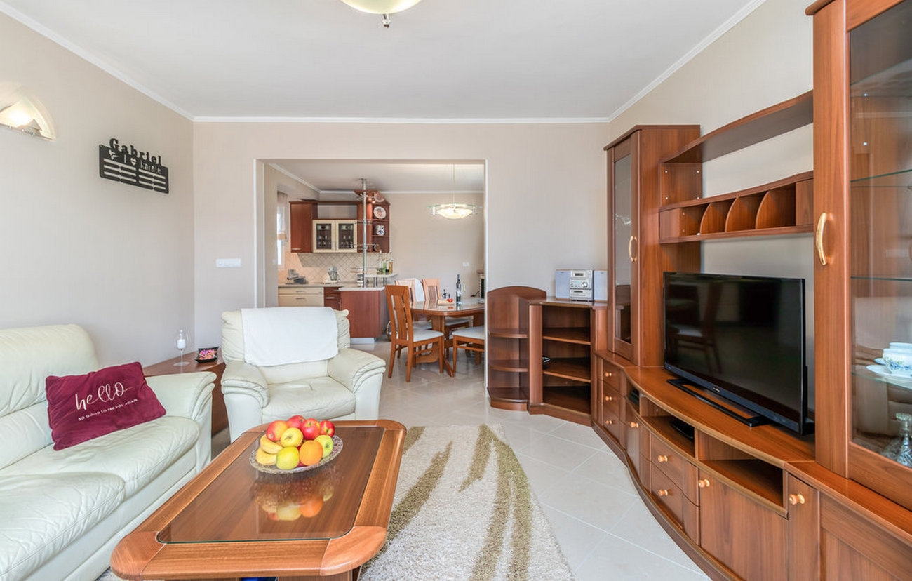 Apartment can accommodate 2 guests. Beds are situated in 1 sleeping rooms, within 53m2. Guests can use a private terrace to enjoy the warm summer evenings. Food can be prepared using barbecue which is shared with other guests too. Shared pool is on disposal during stay. INCLUDED IN THE PRICE: tourist tax, final cleaning, air-conditioning, pool, parking, internet, iron, ironing board, hairdryer, 2 beds for children (included in the price). OBLIGATORY ADDITIONAL COSTS: short stay fee (surcharge depending on a number of booked nights: 30% - 1, 20% - 2, 10% - 3). The availability of additional services for your chosen dates of stay, as well as their prices (if none are listed) must be checked ahead of time. Any additional services not shown in the price calculation are payable directly to the property owner and only if used by the visitor.